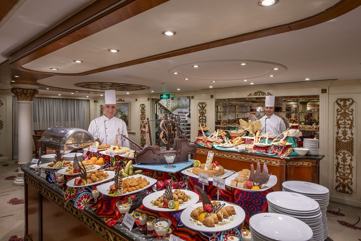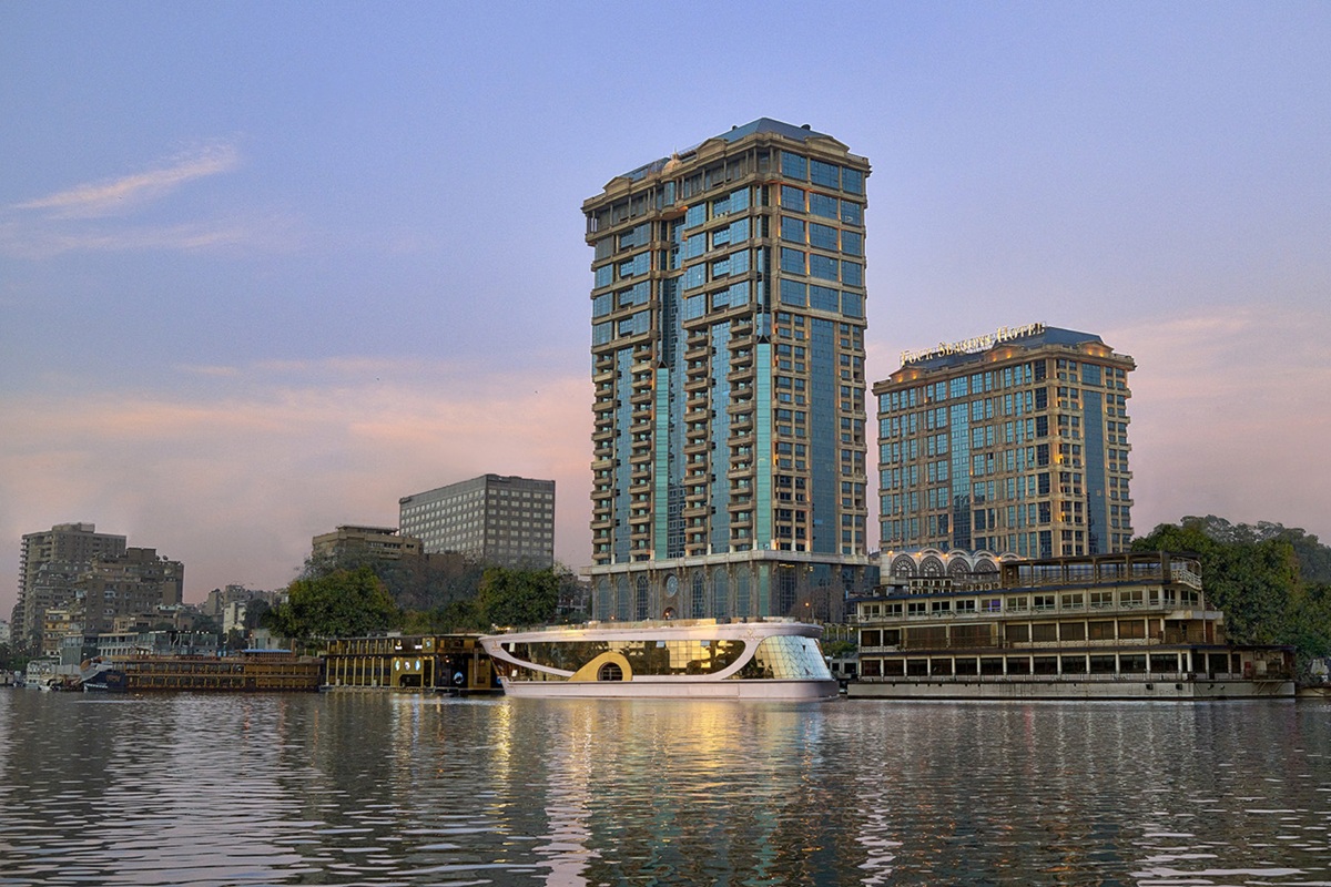 停泊於四季飯店碼頭的First Nile遊船,上層甲板是景觀餐廳Zoé。Zoé得天獨厚的位置,讓遊客得以大啖兼具地中海與中東風味的精緻料理,同時將開羅市區與尼羅河美景盡收眼底,享受國際級的用餐體驗。