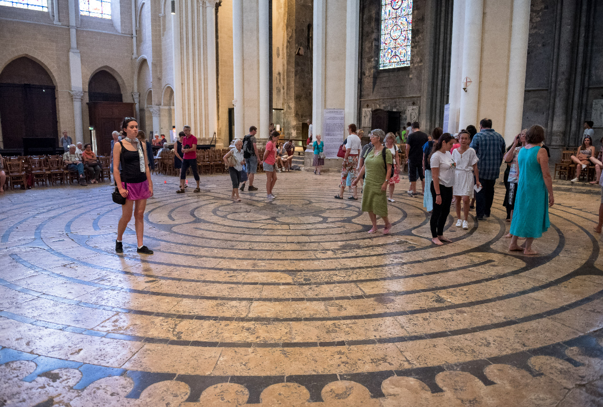 沙特大教堂入口處的地板上,有各種色彩斑斕的石頭堆砌而成圖案。中世紀時許多教堂也有這種圖案(只是大多已無保存),讓人們踱步其上懺悔禱告沉思... 。通常只在夏季的周五和夏至日才會被揭開。